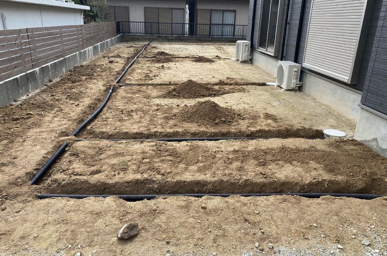 暗渠のいい点は上側の施工(砂利引き、防草シート、人工芝等)の自由度が高いところ!